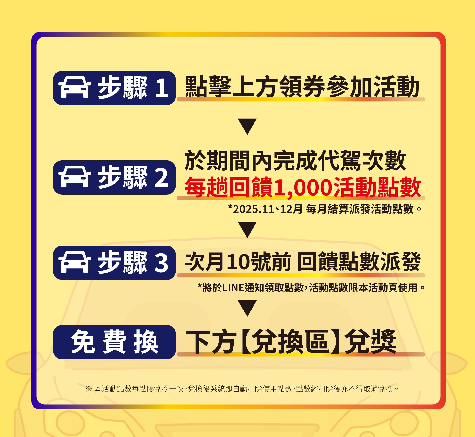 ※請務必於55688 APP中確認領取優惠券,即為報名成功,後續將依照報名者於活動期間內完成之代駕趟次,發送對應之回饋點數,最高可獲得10,000點。